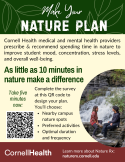 Cornell Health’s medical and mental health providers recommend (or “prescribe”) spending time in nature to students, when clinically appropriate, to reduce stress, improve mood and concentration, and overall well-being. Cornell Health’s medical and mental health providers recommend (or “prescribe”) spending time in nature to students to reduce stress and improve mood, concentration, and overall well-being.